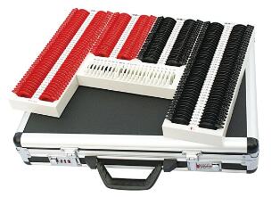 驗光鏡片箱包含箱體、箱蓋和扣件,箱體分區(qū)排布用于驗光試鏡的鏡片插槽,其中,箱體的左、右兩側(cè)分別為負球鏡片區(qū)和正球鏡片區(qū),該 兩區(qū)之間的左側(cè)為負柱鏡片區(qū),右側(cè)為正柱鏡片區(qū),各區(qū)有序排布相應(yīng) 序列鏡片的橫向插槽,并標有試鏡片的辨識符號;其特征是箱體還設(shè)有 附屬鏡片插槽,棱鏡片插槽和漸進多焦點鏡片序列插槽,該三序列共分 布為左右兩個區(qū),左區(qū)對應(yīng)位于負柱鏡區(qū)下方,右區(qū)對應(yīng)位于正柱鏡區(qū) 的下方;左區(qū)設(shè)有24個橫向插槽,共分為12排,每排含有左右兩個插槽,包括附屬鏡片序列中的12個插槽和棱鏡片序列12個插槽,各槽標有對應(yīng)鏡片的辨識符號。